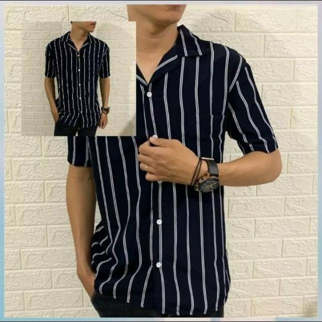 Beli kemeja salur pria stripe lengan pendek cowok premium distro hem garis belang hitam baju strip terbaru harga murah di shopee.